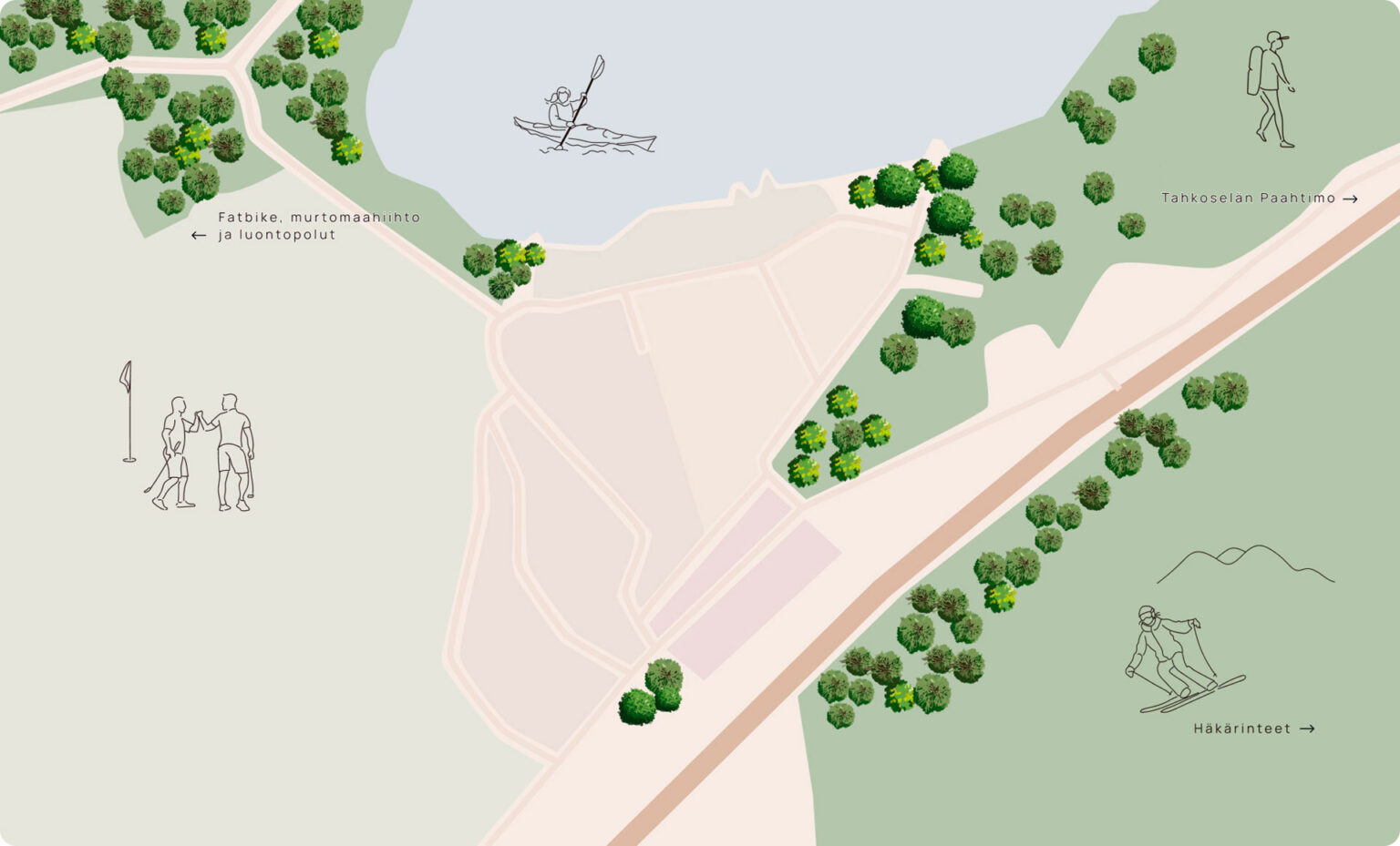 Koe täydellinen golfelämys Revontulessa Keski-Suomessa, missä golfkenttä sijaitsee vain lyhyen kävelymatkan päässä kaikista resortin palveluista.