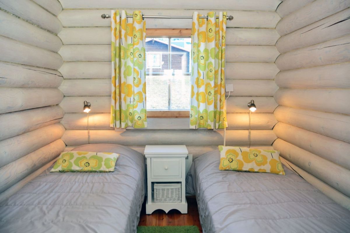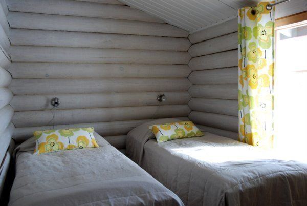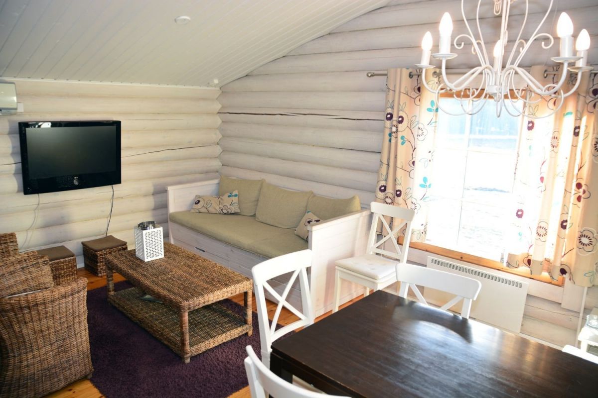 Mökissä on kaksi erillistä 2 hengen makuuhuonetta. Lisäksi tupakeittiö/olohuone, sauna, pesuhuone ja wc. Tupakeittiössä on liesi/uuni, jääkaappi, mikroaaltouuni, kahvinkeitin sekä astiasto kuudelle. Olohuoneen vuodesohvasta saa sängyn kahdelle. Mökissä myös silitysrauta ja hiustenkuivaaja.